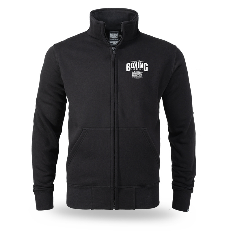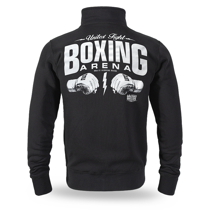 Model with a sporty graphic print on the back, depicting clenched MMA gloves and the inscription “Boxing Arena”. In the background, there are smaller inscriptions: MMA, K1, KICKBOXING, BOXING. A smaller print referring to the main motif is placed on the chest. Comfortable cut made from high-quality cotton. Model designed for combat sports practitioners.