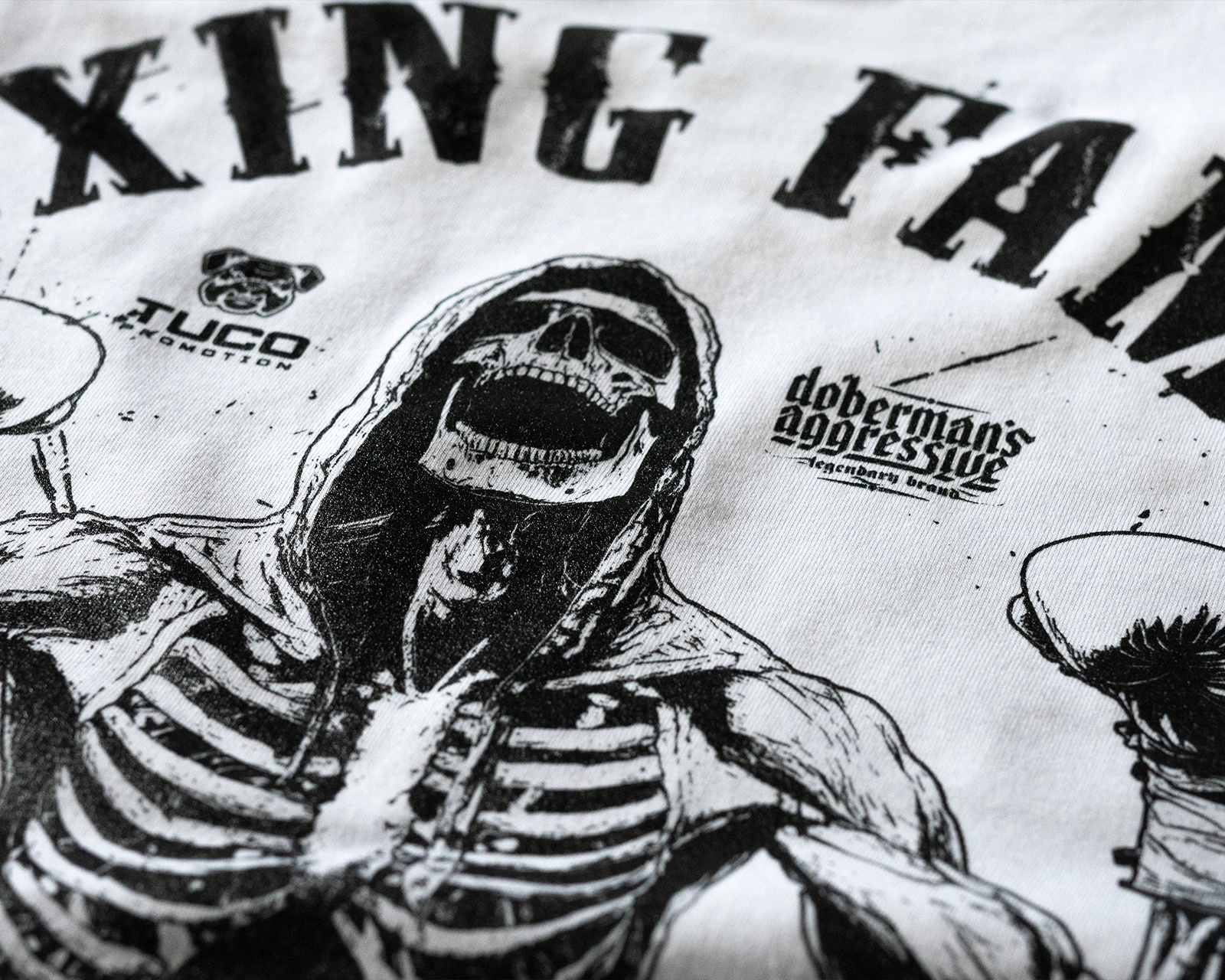 A model inspired by combat sports. On the front, a small graphic with the "Boxing Family" motif is placed on the left chest. The back features a large, detailed print of a skeletal boxer standing in the ring. The graphic is enhanced with the slogans "Ultimate Fight" and "Doberman’s." The sweatshirt has practical front pockets and ribbed cuffs on the sleeves and bottom.