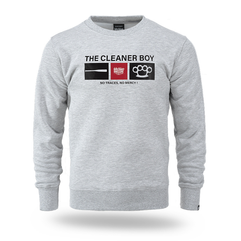 In the center, there is a print with the inscription "THE CLEANER BOY" and graphics showing a bat, the brand logo, and brass knuckles. Below, the slogan: "NO TRACES, NO MERCY!". The product is made of high-quality cotton, ensuring wearing comfort.