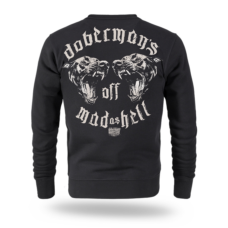 Model featuring a bold back print with two enraged Dobermans and the slogan “Dobermans off mad as hell”. A smaller print with the same graphic motif is placed on the front.
