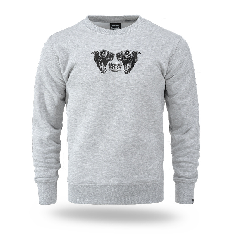 Model featuring a bold back print with two enraged Dobermans and the slogan “Dobermans off mad as hell”. A smaller print with the same graphic motif is placed on the front.