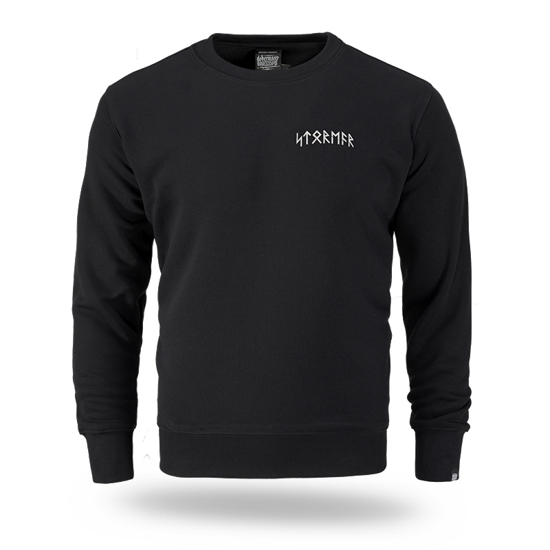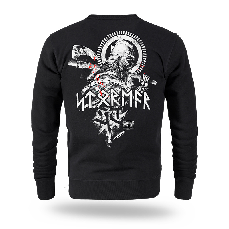 The model stands out with an impressive back print featuring a Norse warrior in a helmet, holding a shield and an axe. The design is completed with a large “STORMER” inscription styled in runic alphabet, which also appears on the front chest.