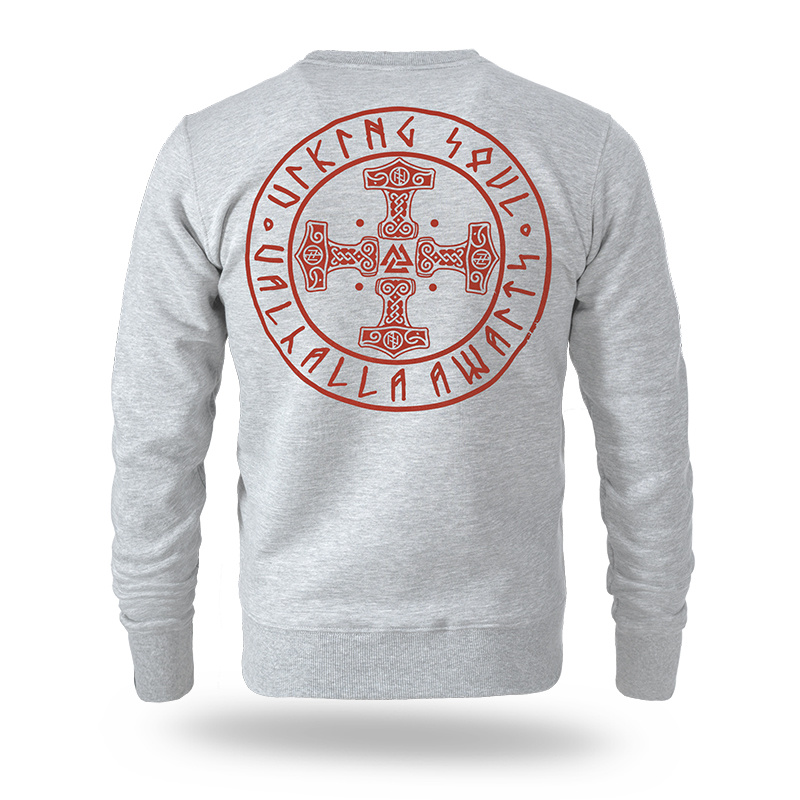 This model stands out with a back print featuring a Nordic cross decorated with runic inscriptions and Viking symbols. The inscriptions read: VIKING SOUL – VALHALLA AWAITS. A smaller print referencing the main design is placed on the chest.