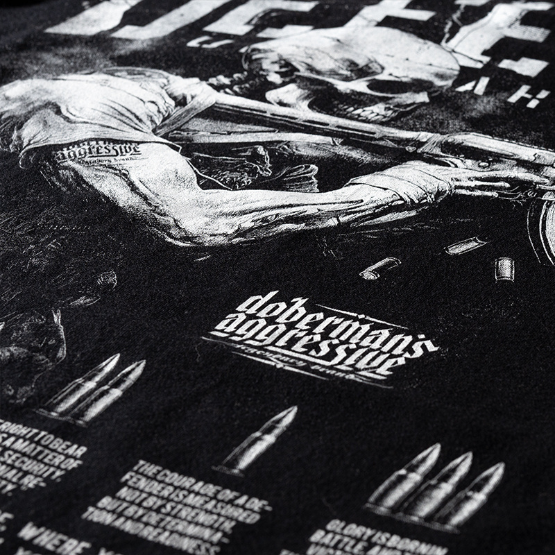 Made of high-quality cotton, ensuring wearing comfort. The back features a large, detailed print of an armed warrior with a skull, surrounded by flying bullet casings. Above, the bold slogan "DEFENSE UNBREAKABLE". Below, additional graphic elements, including bullets and a defense-inspired message. On the front, a small print on the left chest area, depicting three bullets and a logo.