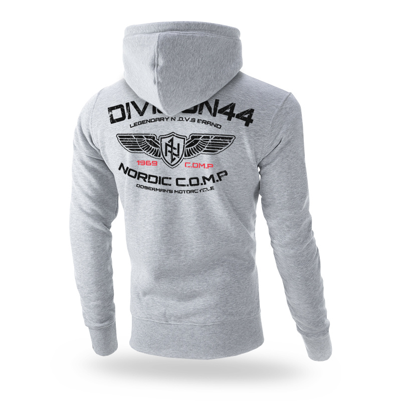 High on the back there is a sign with the collection mark. Each letter has been sewn on an extra material. Below there is a graphics with shield theme and steel wings. Below it the "Nordic C.O.M.P." inscription. Male model with a high collar, hood and wide cuffs. On the front there is a zipper and two patch pockets. Hood strings, metal fittings and red tab with brand logo. Inside each sweatshirt there is a pleat and a large label with the image of an eagle. Heavyweight fabric (320g.)