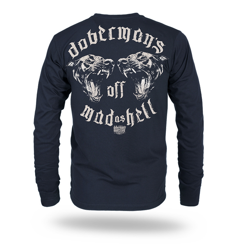 Model featuring a bold back print with two enraged Dobermans and the slogan “Dobermans off mad as hell”. A smaller print with the same graphic motif is placed on the front.