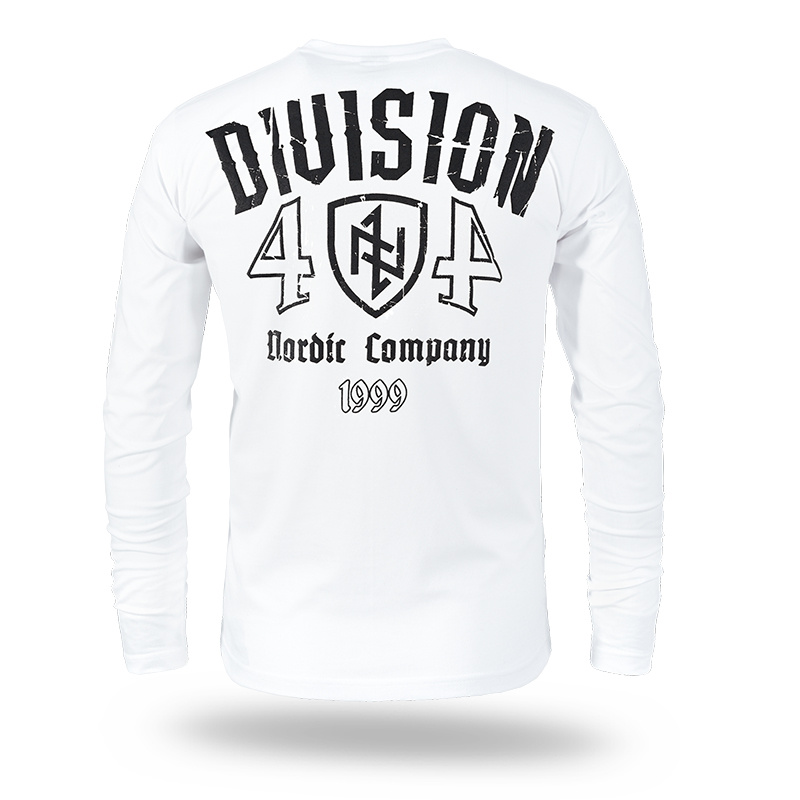 Model with a large print on the back featuring the inscription "Division 404" and a shield with a symbol, emphasizing the brand's distinctive style. On the front, there is a smaller print repeating elements from the back. Additionally, the back features a smaller "Nordic Company" inscription. The product is made of high-quality cotton, ensuring comfort and durability.
