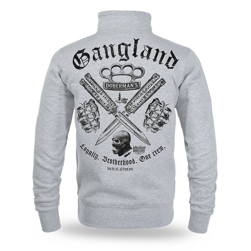 On the back, there is a bold print featuring brass knuckles, butterfly knives, clenched fists, and a figure in a balaclava. Below are the slogans: Loyalty. Brotherhood. One crew. and One for all, all for one. On the front, at chest level, there is a smaller print with brass knuckles and the Doberman's inscription.