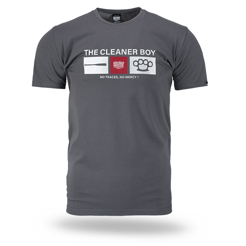 In the center, there is a print with the inscription "THE CLEANER BOY" and graphics showing a bat, the brand logo, and brass knuckles. Below, the slogan: "NO TRACES, NO MERCY!". The product is made of high-quality cotton, ensuring wearing comfort.