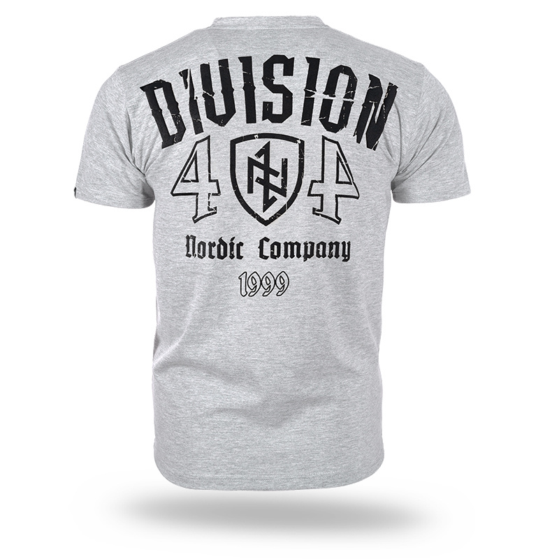 Model with a large print on the back featuring the inscription "Division 404" and a shield with a symbol, emphasizing the brand's distinctive style. On the front, there is a smaller print repeating elements from the back. Additionally, the back features a smaller "Nordic Company" inscription. The product is made of high-quality cotton, ensuring comfort and durability.