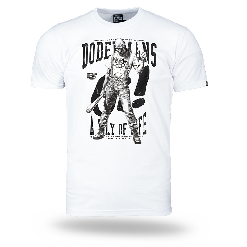 The T-shirt is made of high-quality cotton, ensuring comfort and durability. The front features a large, detailed print depicting a Skinheads figure holding a baseball bat. In the background, a large logo and the inscription "DOBERMANS A WAY OF LIFE" add a raw, street-inspired character. This model is dedicated to those who appreciate bold designs and a style inspired by street subcultures.