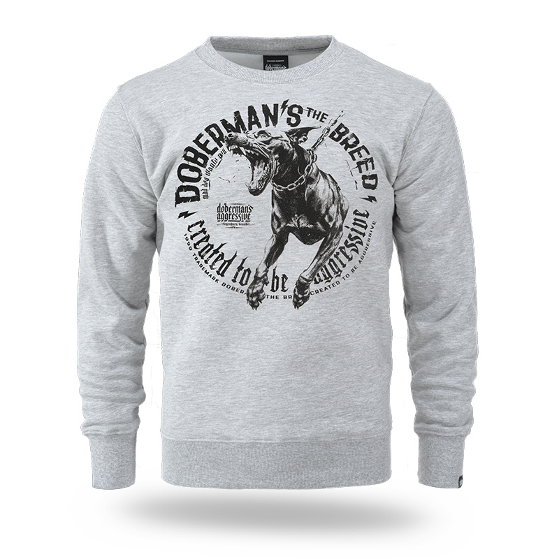 A comfortable model made of high-quality materials for optimal wearing comfort. The front features a large graphic of an aggressive Doberman, surrounded by dynamic inscriptions: DOBERMAN’S THE BREED and CREATED TO BE AGGRESSIVE. Elastic cuffs on the sleeves and bottom ensure a good fit.