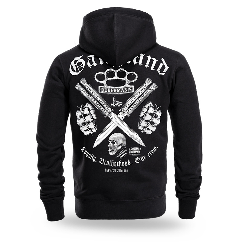 On the back, there is a bold print featuring brass knuckles, butterfly knives, clenched fists, and a figure in a balaclava. Below are the slogans: Loyalty. Brotherhood. One crew. and One for all, all for one. On the front, at chest level, there is a smaller print with brass knuckles and the Doberman's inscription.