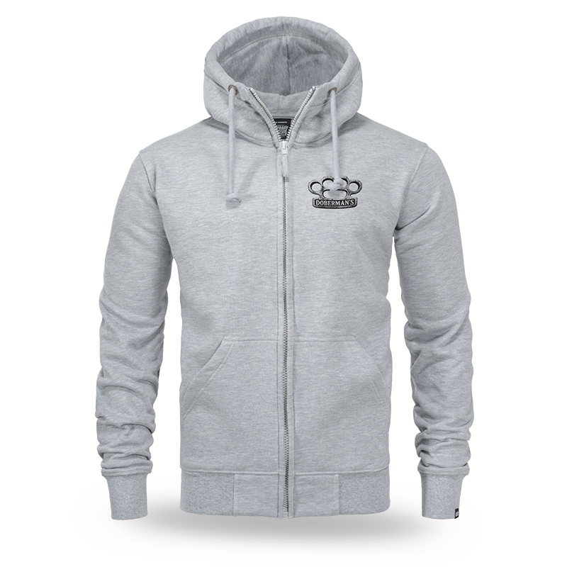 On the back, there is a bold print featuring brass knuckles, butterfly knives, clenched fists, and a figure in a balaclava. Below are the slogans: Loyalty. Brotherhood. One crew. and One for all, all for one. On the front, at chest level, there is a smaller print with brass knuckles and the Doberman's inscription.