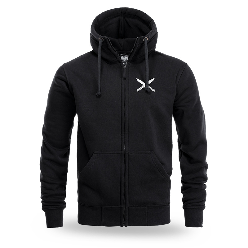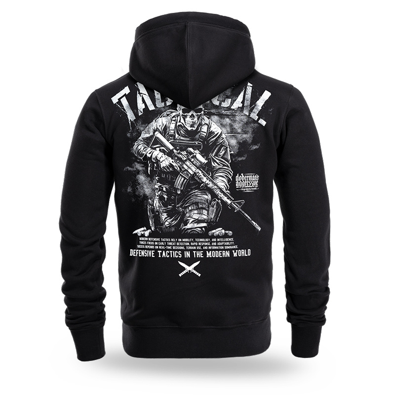 On the back, there is a dynamic print showing a skeleton with a rifle in a combat composition with the slogan "TACTICAL". Below it is the phrase "Defensive tactics in the modern world" along with additional English text. A smaller graphic motif with two crossed knives is placed on the front.