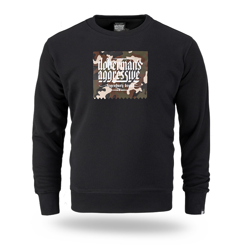 Na klatce piersiowej znajduje się nadruk w formie prostokąta z motywem kamuflażu, na którym umieszczono logo marki Dobermans Aggressive.