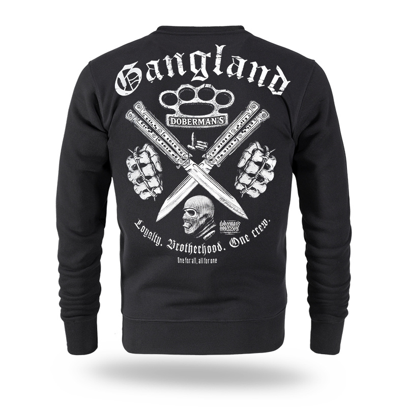 Na plecach znajduje się odważny nadruk z grafiką kastetów, noży motylkowych, zaciśniętych pięści i postaci w kominiarce. Poniżej widnieją hasła: Loyalty. Brotherhood. One crew. oraz One for all, all for one. Z przodu, na piersi, umieszczono mniejszy nadruk z kastetem i napisem Doberman's.