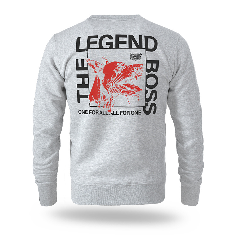 Na plecach duża grafika z psem w intensywnej czerwieni i hasłem "THE LEGEND BOSS – ONE FOR ALL. ALL FOR ONE", z przodu niewielki nadruk z tym samym napisem. Model posiada elastyczne ściągacze na rękawach i u dołu, a także okrągły dekolt wykończony lamówką.