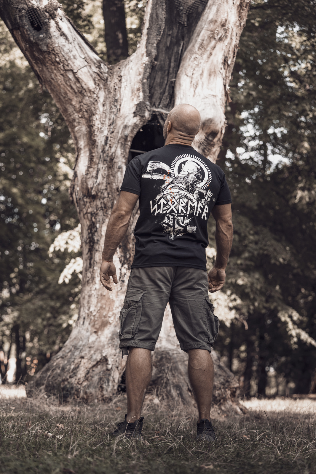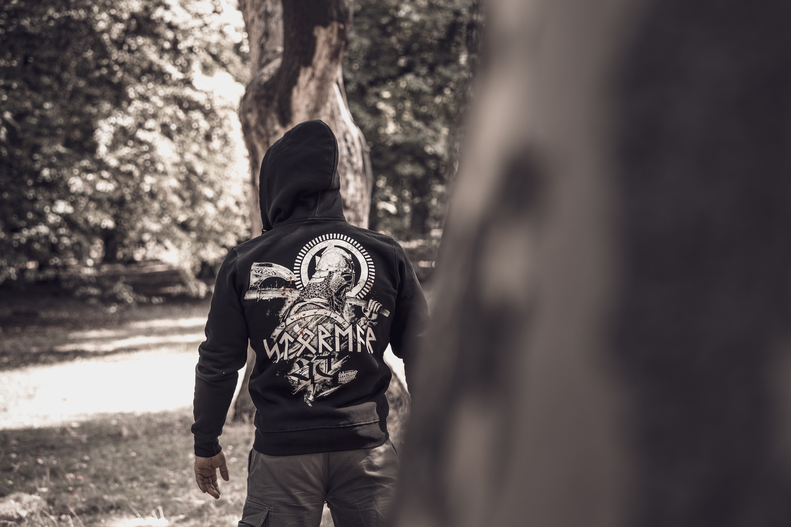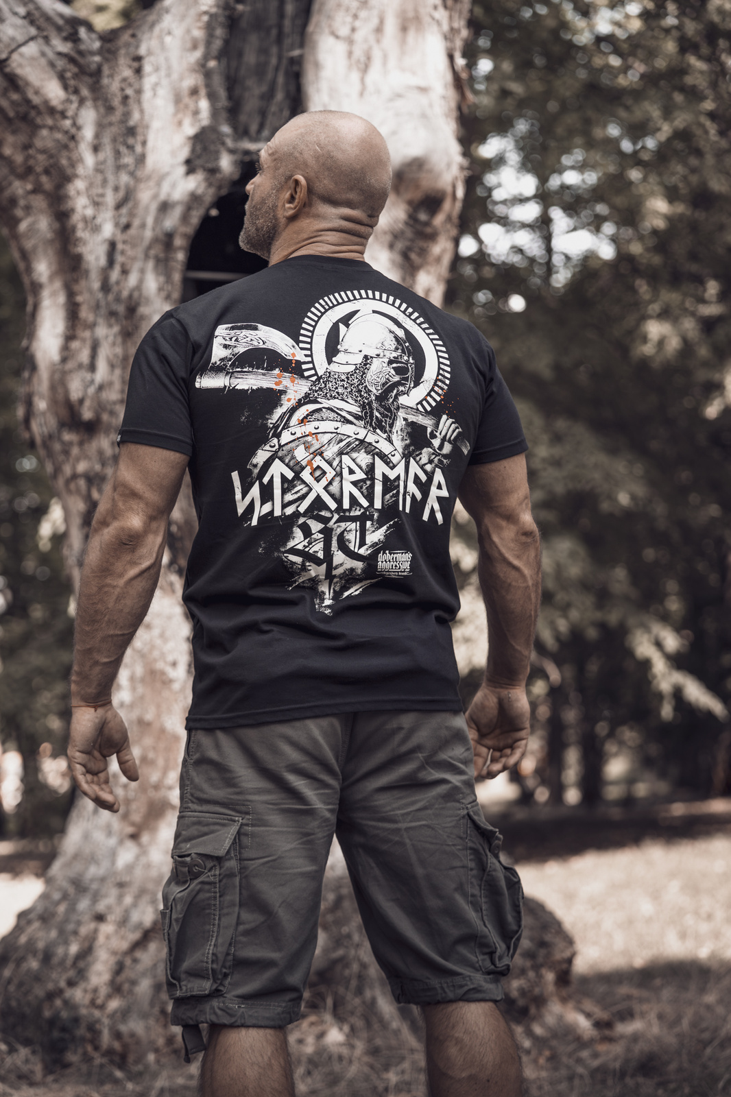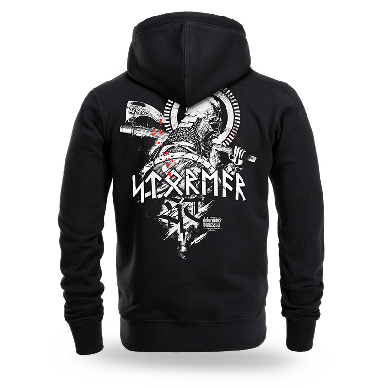 Model wyróżnia się efektownym nadrukiem na plecach przedstawiającym nordyckiego wojownika w hełmie, z tarczą i toporem w dłoniach. Projekt uzupełnia duży napis „STORMER” stylizowany na runiczny alfabet, który widnieje również z przodu na piersi.