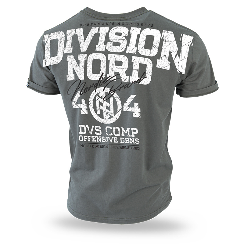 Wąski ściągacz przy szyi oraz mała metka z logo Dobermans Aggressive na lewym rękawie. W środku tkana metka. Na plecach duża grafika złożona z napisów, wykorzystano efekt podniszczenia nadruku. Napis Division przechodzi przez szwy obu rękawków. Poniżej duża cyfra 404 oraz ozdobny tekst Nordic Brand. Wzór w dwóch kolorach. Z przodu niewielki nadruk na lewej piersi.