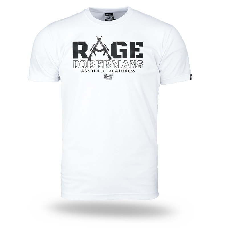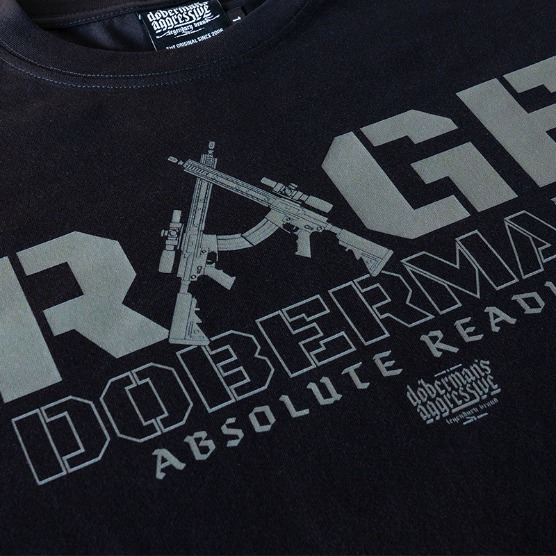 Odzież wykonana z bawełny o gramaturze 200g. Na lewym rękawku mała metka z logo Doberman’s Aggressive. Z przodu koszulki znajduje się napis RAGE DOBERMANS wykonany militarną czcionką. Charakterystycznym elementem tego modelu są dwa karabiny skrzyżowane ze sobą tworzące literę A.