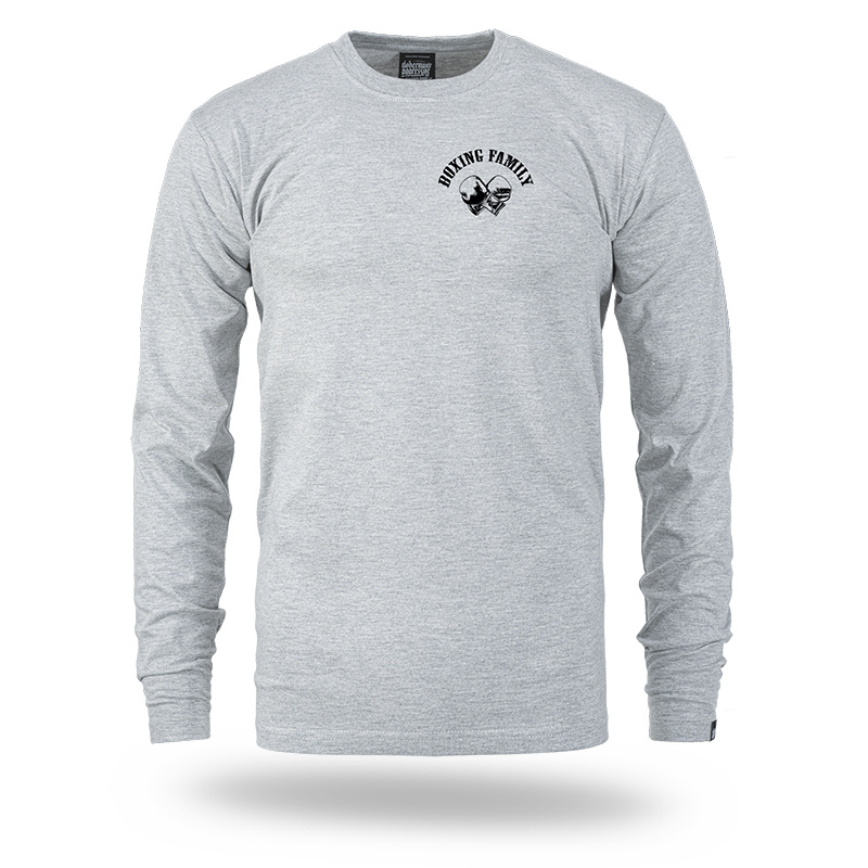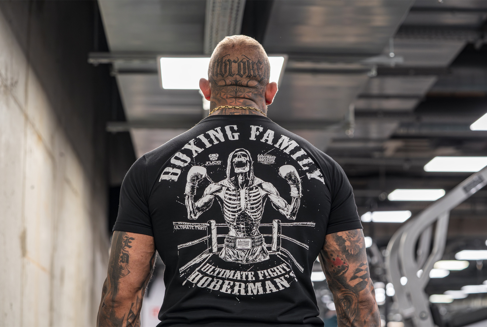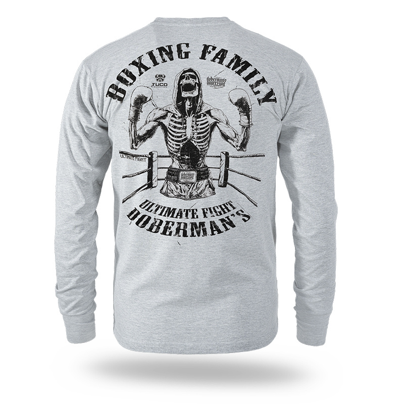 Koszulka z długim rękawem dla miłośników sportów walki. Na froncie znajduje się subtelny nadruk z logo "Boxing Family", natomiast na plecach duża, szczegółowa grafika przedstawiająca szkielet boksera w ringu, otoczona dynamicznym napisem "Boxing Family - Ultimate Fight - Doberman's". Model wykonany z wysokiej jakości materiału, który zapewnia komfort noszenia i trwałość nadruku. Idealna propozycja dla fanów boksu i sportów kontaktowych.