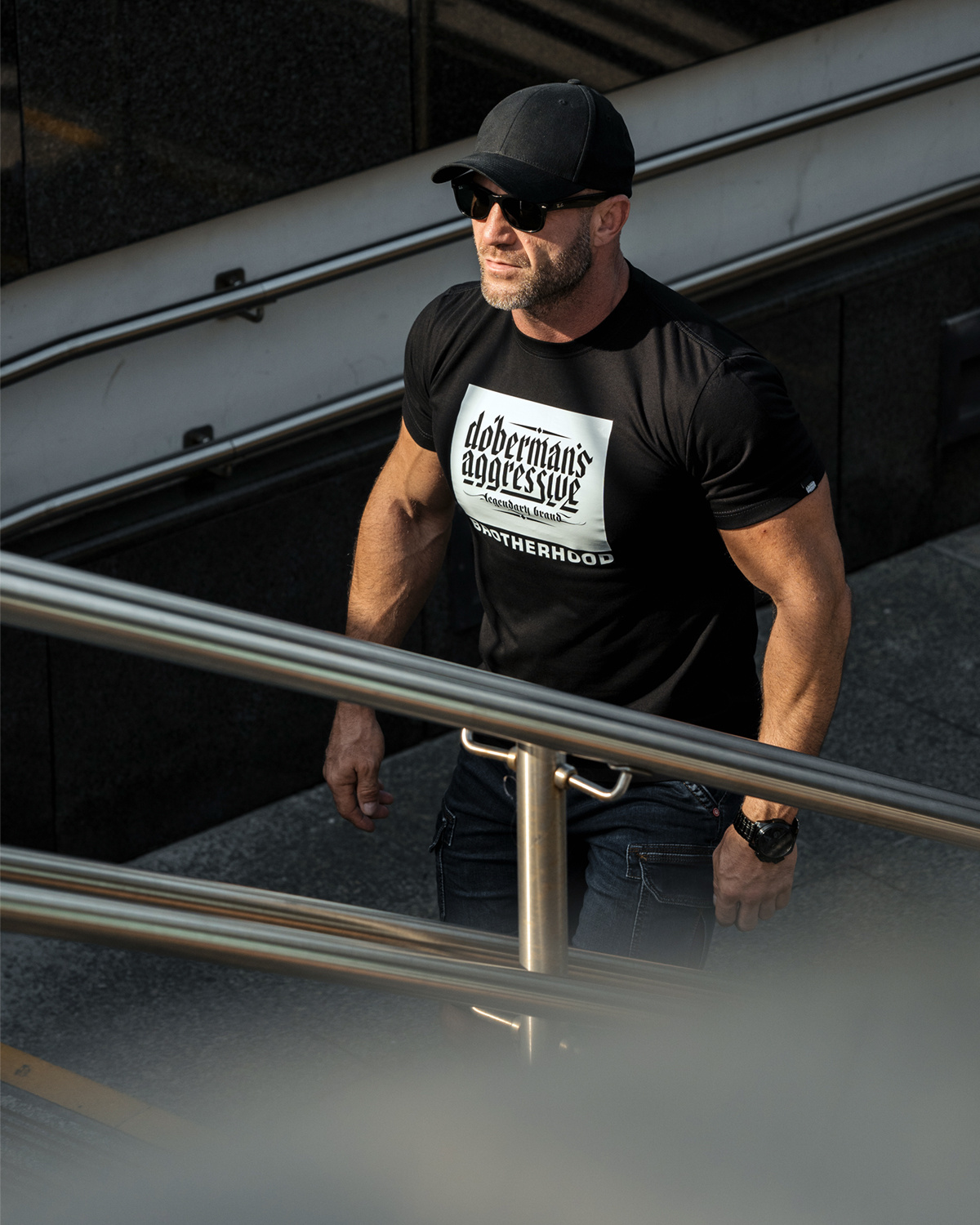 Wykonana z bawełny o wysokiej gramaturze. Na lewym rękawie wszyta mała metka z logo marki. Z przodu koszulki znajduję logo marki Dobermans wkomponowane w prostokąt, pod nim napis Brotherhood.