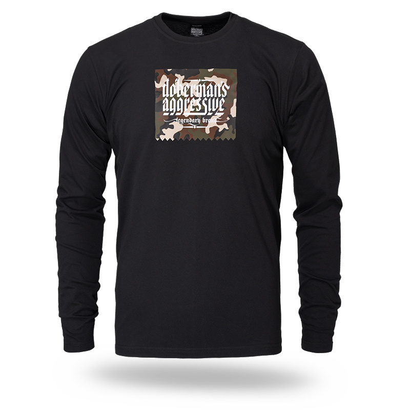 Na klatce piersiowej znajduje się nadruk w formie prostokąta z motywem kamuflażu, na którym umieszczono logo marki Dobermans Aggressive.