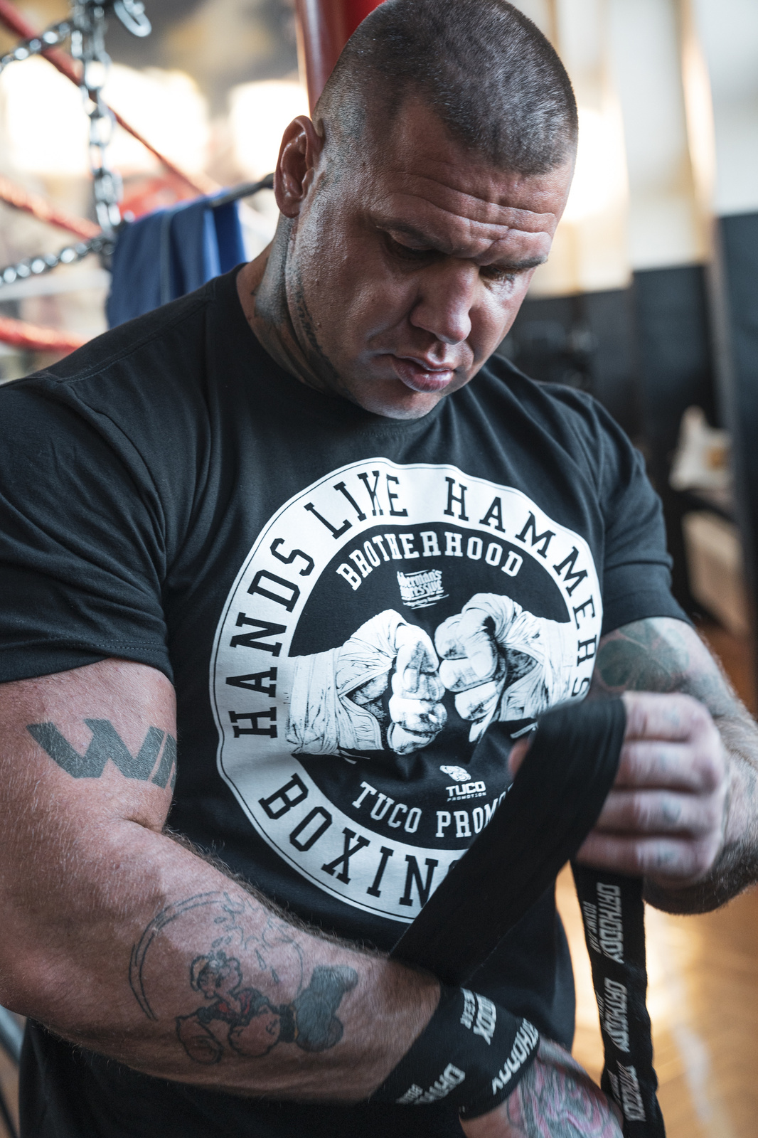 Z przodu koszulki umieszczono okrągłą grafikę z motywem pięści i napisami nawiązującymi do braterstwa i sportów walki. Centralnym elementem projektu jest hasło "HANDS LIKE HAMMERS", które podkreśla siłę i charakter. Koszulka wykonana z wysokiej jakości bawełny, zapewniającej komfort noszenia i trwałość nadruku.