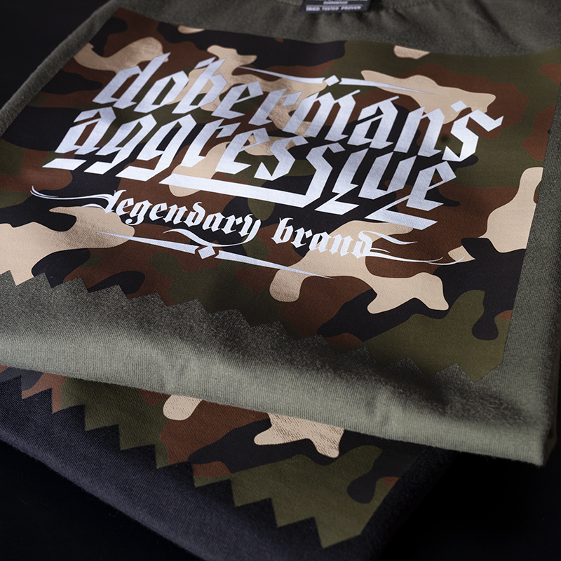 Na klatce piersiowej znajduje się nadruk w formie prostokąta z motywem kamuflażu, na którym umieszczono logo marki Dobermans Aggressive.