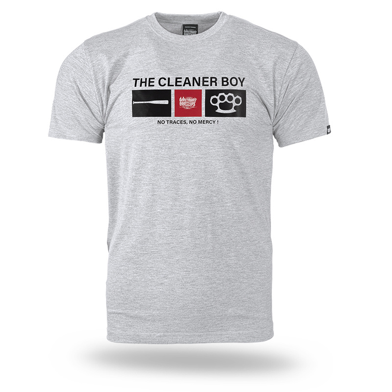 W centralnej części znajduje się nadruk z napisem „THE CLEANER BOY” oraz grafikami przedstawiającymi pałkę, logo marki i kastet. Poniżej hasło: „NO TRACES, NO MERCY!”. Produkt wykonany z wysokiej jakości bawełny, gwarantującej komfort noszenia.