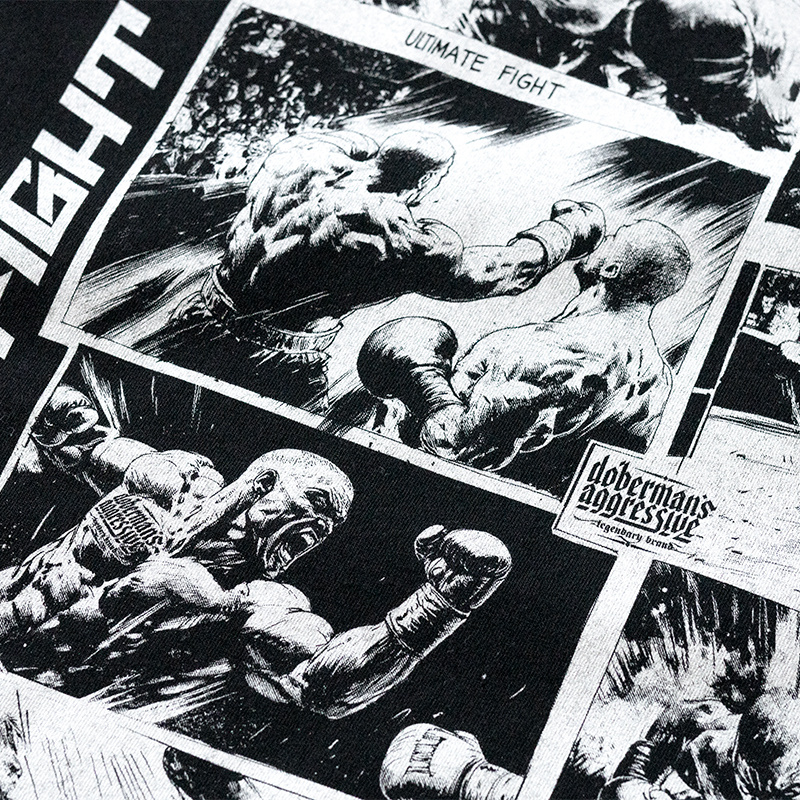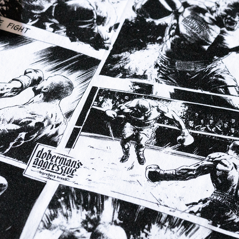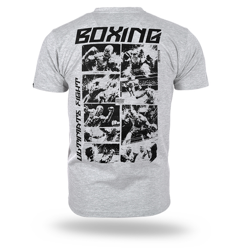 Koszulka wykonana z wysokiej jakości materiału, zapewniającego wygodę i trwałość. Na plecach znajduje się duży, efektowny nadruk w stylu komiksowym przedstawiający dynamiczne sceny bokserskie. Przód ozdobiony minimalistycznym nadrukiem z nazwą kolekcji i logo producenta. Krój gwarantuje swobodę ruchu. Idealna dla miłośników sportów walki i odważnych, graficznych wzorów.