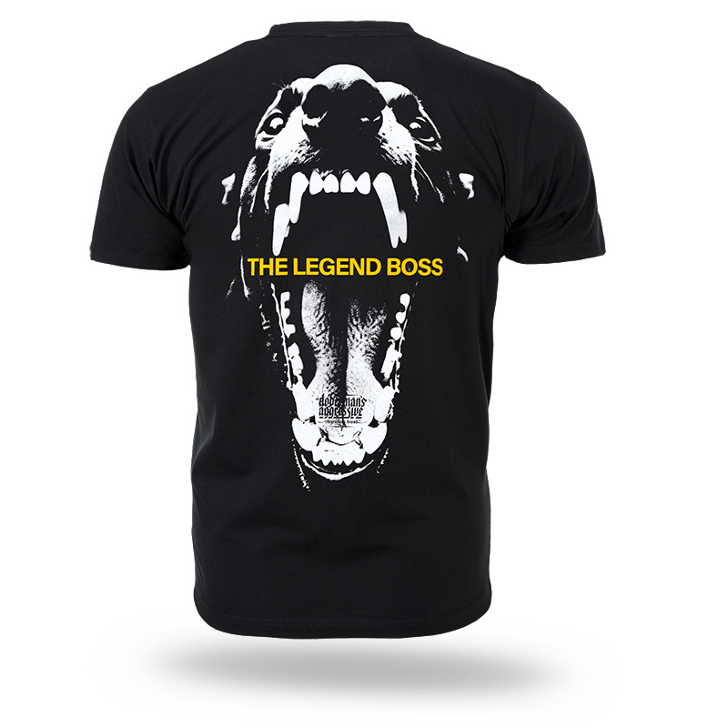 Na piersi umieszczony mały napis „THE LEGEND BOSS”, a tył zdobi duża grafika z otwartą paszczą psa oraz napisem „THE LEGEND BOSS” w kontrastującym kolorze. Produkt wykonany z wysokiej jakości bawełny, zapewniającej komfort noszenia.