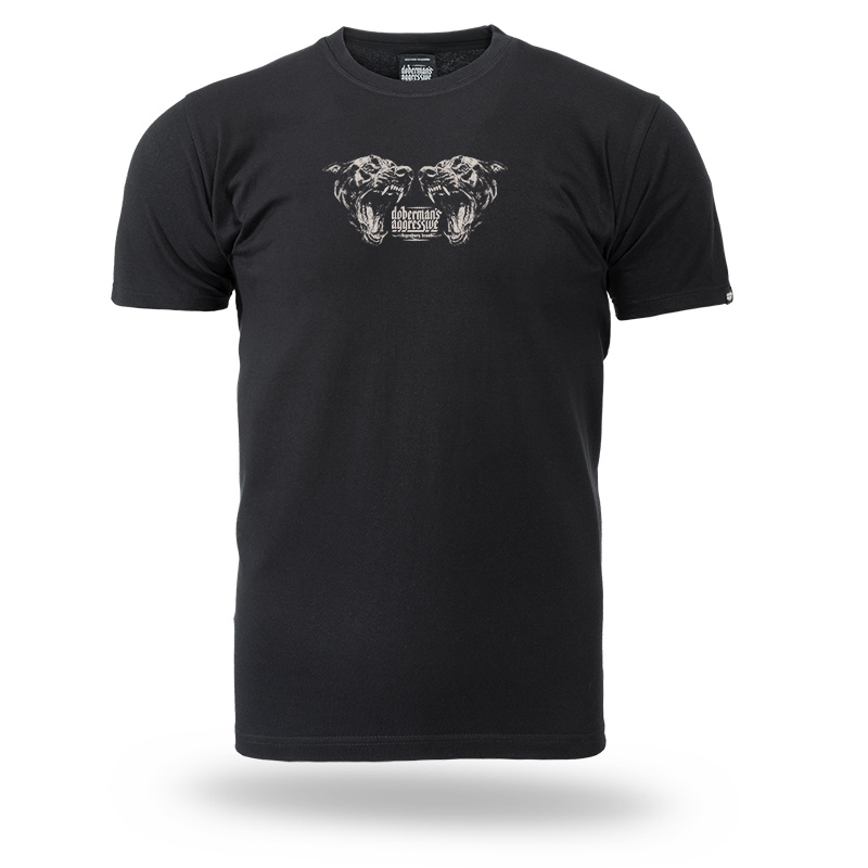 Model z odważnym nadrukiem na plecach, przedstawiającym dwa rozwścieczone dobermany i hasło „Dobermans off mad as hell”. Z przodu znajduje się mniejszy nadruk z tym samym motywem graficznym.