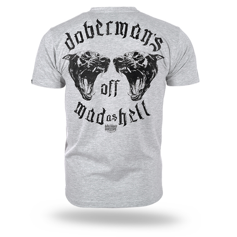 Model z odważnym nadrukiem na plecach, przedstawiającym dwa rozwścieczone dobermany i hasło „Dobermans off mad as hell”. Z przodu znajduje się mniejszy nadruk z tym samym motywem graficznym.