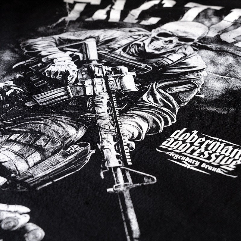 Z tyłu znajduje się dynamiczny nadruk przedstawiający szkielet z karabinem w kompozycji bojowej z hasłem „TACTICAL”. Poniżej umieszczono napis „Defensive tactics in the modern world” oraz dodatkowy tekst w języku angielskim. Z przodu widoczny jest mniejszy motyw graficzny z dwoma skrzyżowanymi nożami.