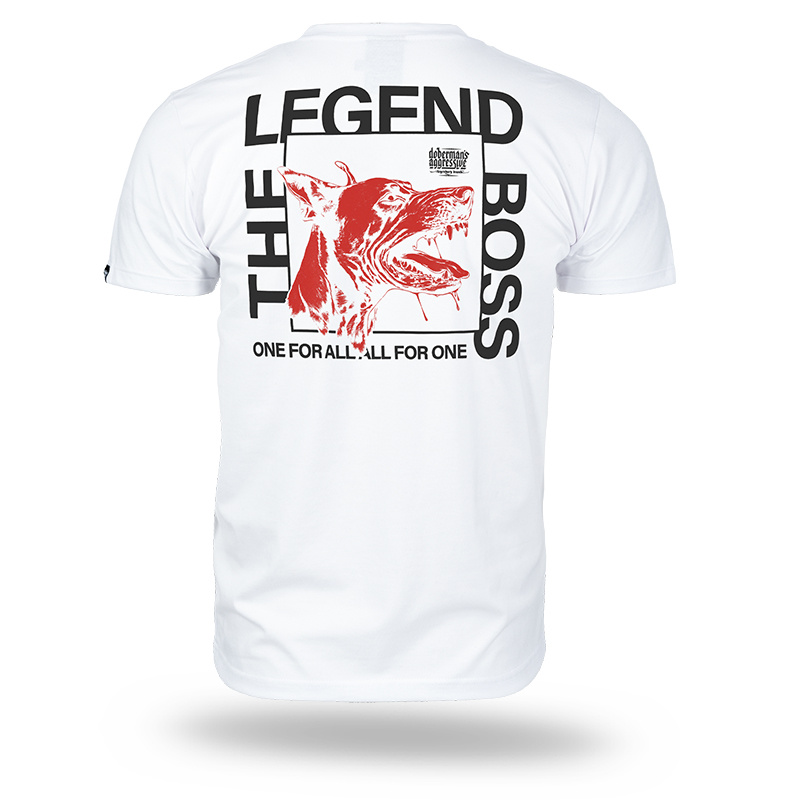 Wykonany z wysokogatunkowej bawełny, zapewnia komfort noszenia i trwałość nadruku. Na plecach znajduje się duża grafika przedstawiająca psa rasy doberman z hasłami „THE LEGEND BOSS” i „ONE FOR ALL. ALL FOR ONE”. Na piersi umieszczono mniejszy napis nawiązujący do motywu graficznego.