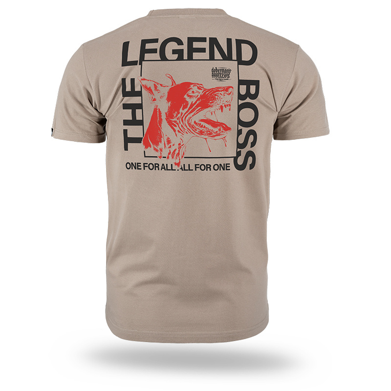 Wykonany z wysokogatunkowej bawełny, zapewnia komfort noszenia i trwałość nadruku. Na plecach znajduje się duża grafika przedstawiająca psa rasy doberman z hasłami „THE LEGEND BOSS” i „ONE FOR ALL. ALL FOR ONE”. Na piersi umieszczono mniejszy napis nawiązujący do motywu graficznego.
