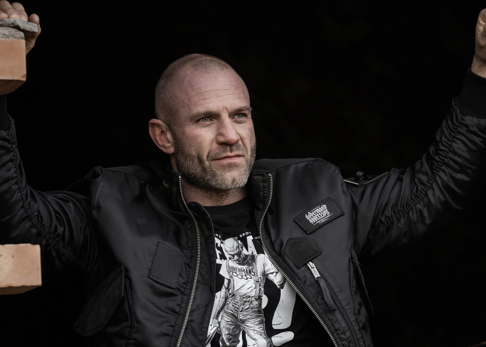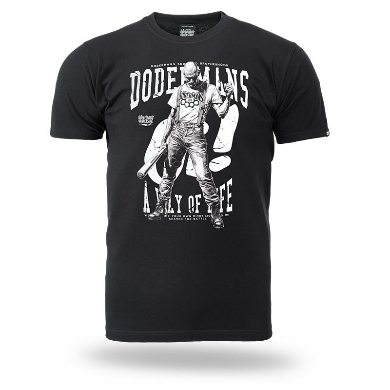Koszulka wykonana z wysokiej jakości bawełny, zapewniająca wygodę i trwałość. Na froncie znajduje się duży, szczegółowy nadruk przedstawiający postać Skinheads z kijem baseballowym w dłoni. W tle widnieje duże logo oraz napis „DOBERMANS A WAY OF LIFE”, nadający całości surowy, uliczny charakter. Model dedykowany osobom ceniącym odważne wzory i styl inspirowany subkulturami ulicznymi.
